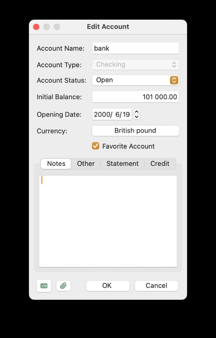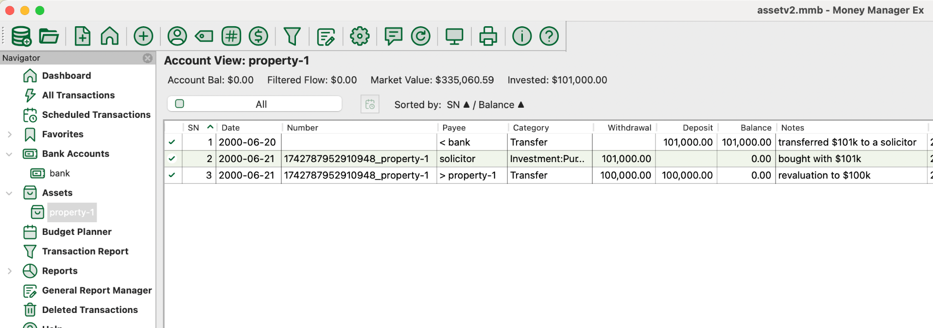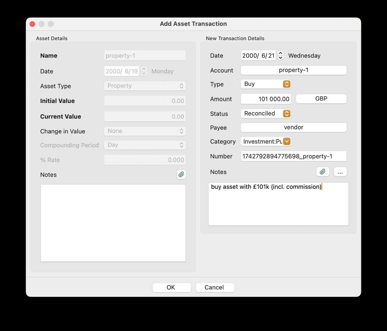 Step 3, I create a (non-asset) transaction on 2000-06-20 which transfers £100k from the bank account to the asset account and a withdrawal of £1k from the bank account, with payee "solicitor", on the same date.
