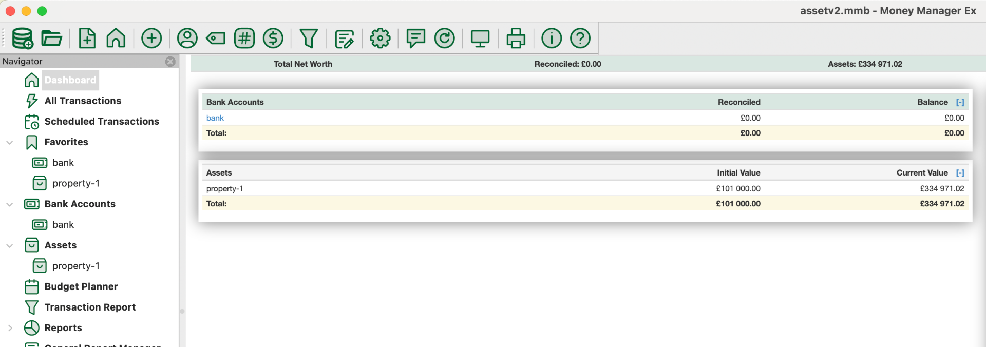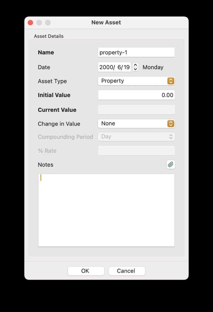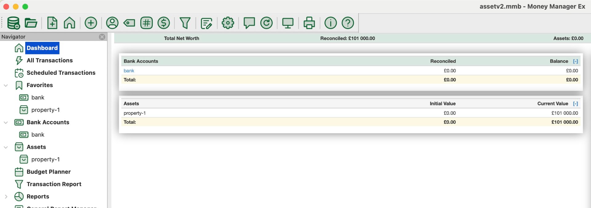 Then, create the asset of the house at 100,000, and set an appreciation factor of x% based on market conditions. MMEX will then keep the value updated. Your net worth is now 1,000 less than it was at the start of the process, being the payment to the solicitor, with the asset offsetting the reduction of 100,000 from the bank account.