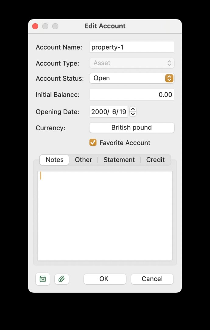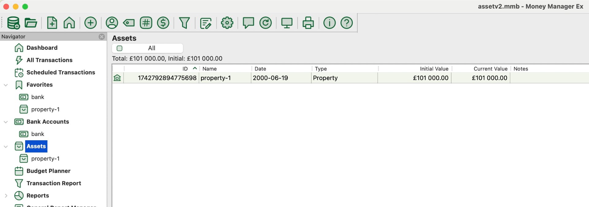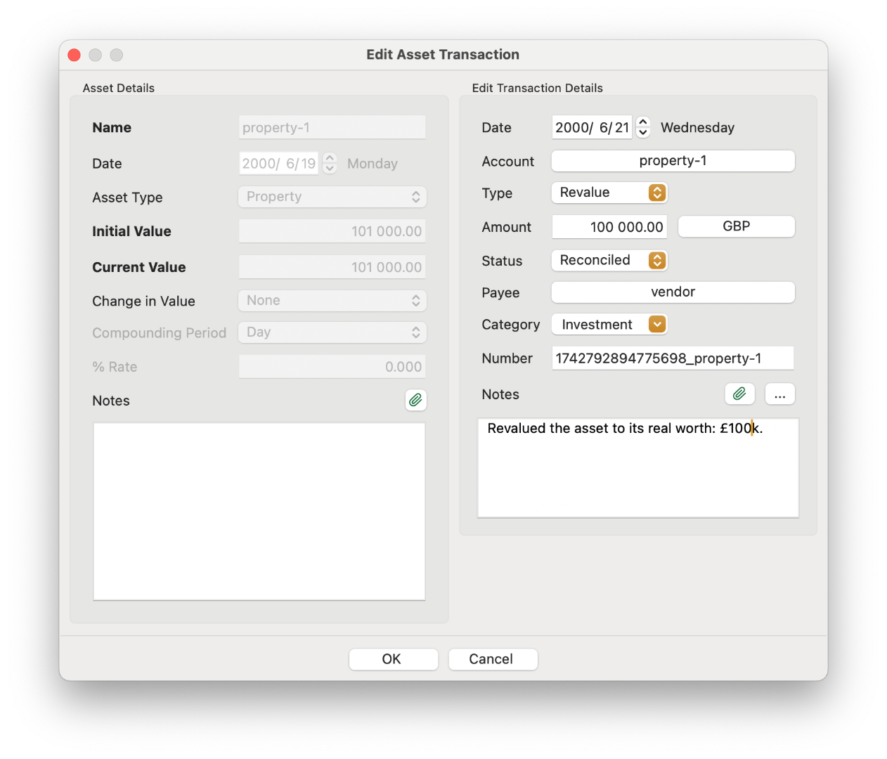 Step 2. On 2000-06-19, I created an asset "property-1" with an initial value of £0 and an associated asset account also named "Property" or "property-1" with an initial balance of £0, i.e., before any property-related transactions.